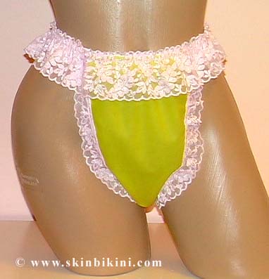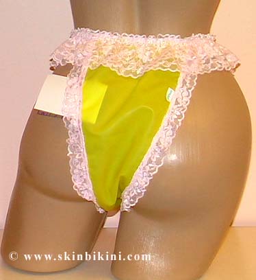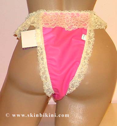 Very sexy and sassy thong brief panty, slick. The entire brieft is made with soft slippery latex rubber, very comfortable and it is semi-SEE-THRU. The entire brief is lined with lovely white floral lace to give you that extra luxury accent and additional feminine touch. There is plenty of room in the front for a man's anatomy and this latex rubber material is very stretchy! Waist is stretchable with reinforcing stitches. The material is very durable and will last. Hand wash only.