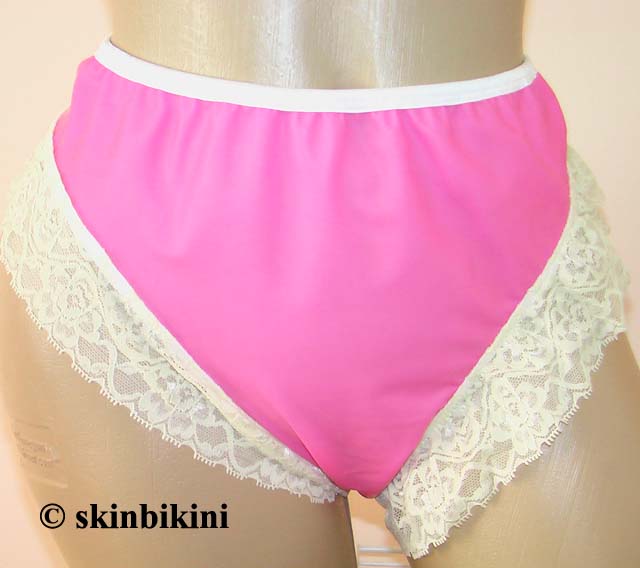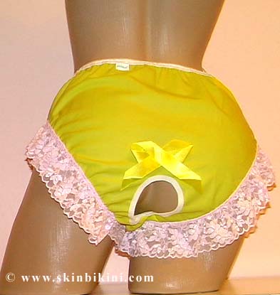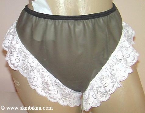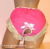 Naughty plug openning with a pink bow! Very sexy and sassy thong brief panty, slick. The entire brieft is made with soft slippery latex rubber, very comfortable and it is semi-SEE-THRU. The leg opening is lined with lovely white floral lace to give you that extra luxury accent and additional feminine touch. There is plenty of room in the front for a man's anatomy and this latex rubber material is very stretchy! Waist is stretchable with reinforcing stitches. The material is very durable and will last. Hand wash only.