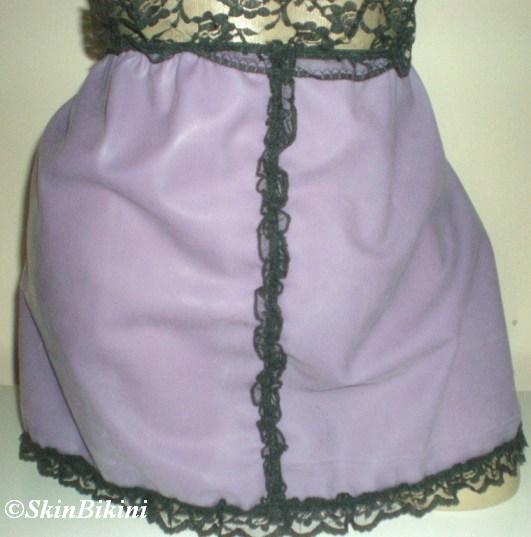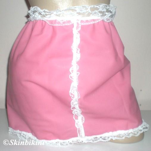 The latex rubber is 4 way stretchable and soft, smooth & comfotable. When it is stretched, the material is semi-see-thru. The skirt is trimmed with lots of lace on the top and bottom and the centre. The center bow gives the additional feminine touch. Waist is stretchable with reinforcing stitches. Great to go with your sissy panties. The material is very durable and will last. Hand wash only.