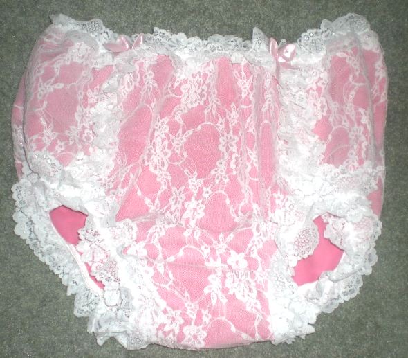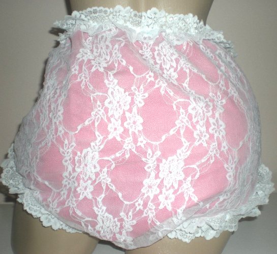 Very sexy and sassy thong brief panty. This is a great mix, the inside is slippery pink latex rubber and the outside is lace. The front has plenty of room for a man's anatomy. The latex material is very stretchy!! The front, leg and waist are lined with generous lovely white floral lace to give you that extra luxury accent and the pink bows give the additional feminine touch. Waist is stretchable with reinforcing stitches. The entire panty is just so delicious. Don't miss out, buy it for him! (It can also be for her). Hand wash only.