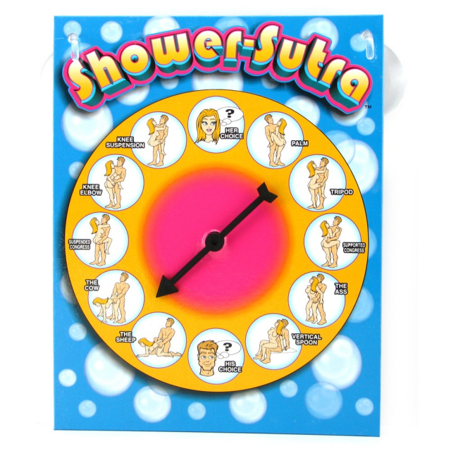 Shower sex turns even hotter with Shower-Sutra, a simple game for playful lovers. Attaching securely to your shower stall wall or hot tub, the waterproof game board displays a spinner board detailing a range of sex positions. Just give 'er a spin and copy the position the arrow lands on.