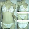 This elegant and sexy bikini swimwear is entirely hand-made. Using the latest stretchy cotton material, it is also light weight as well. The bikini bottom is full cover Brazilian style side-tie. It sits low on the hip. Part of the floral pattern is see-thru but it still covers the important areas. Great beachwear! It is NOT lined at the chest and bottom areas.