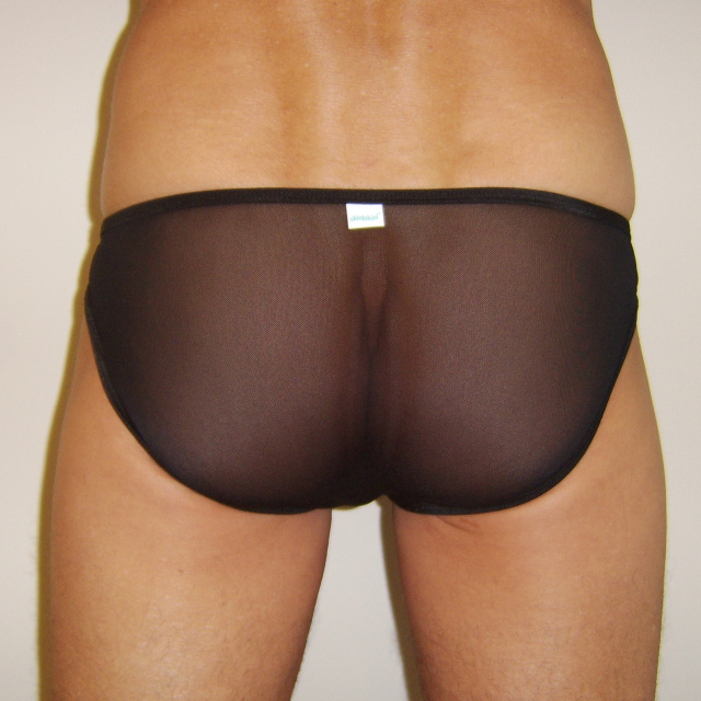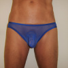 We use the same mesh material as the women's on the men's bikini. Be warned: it may become totally see-thru when wet. The material is stretchy.