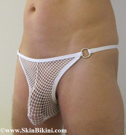 We use the same fishnet material as the women's on the men's bikini. They are see-thru. The material is stretchy. The more it gets stretched the more sheer it becomes! Two stainless steel rings on the side give it an extra touch. Take a look on the clever use of the ring on pictures sent in by our customer R.B below