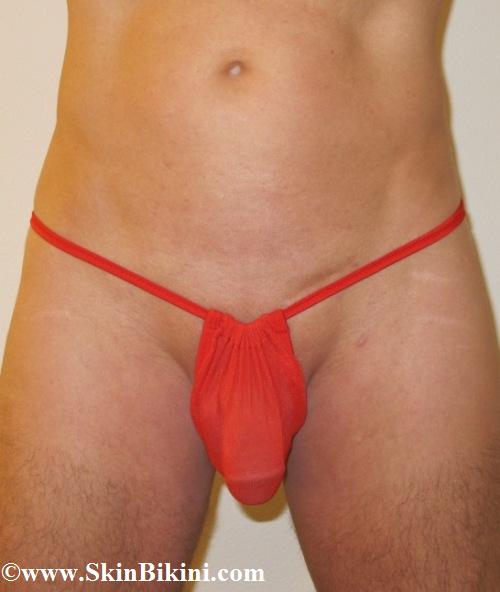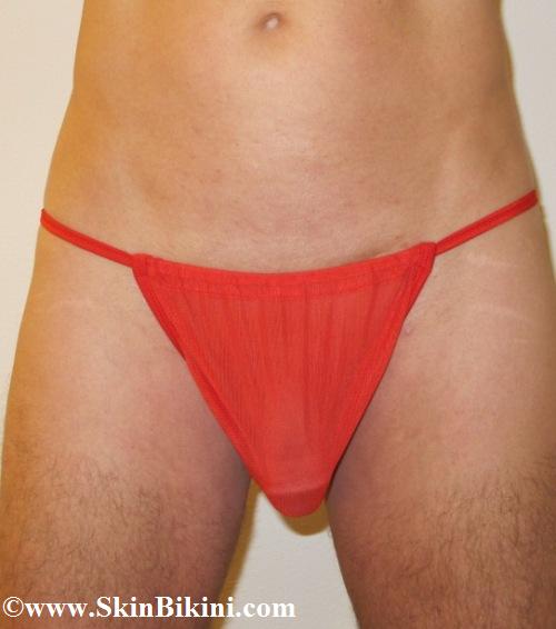 We use the same mesh material as the women's on the men's bikini. They are see-thru. The material is stretchy. The more it gets stretched the more sheer it becomes! Both the front and back are adjustable and you can make them as wide as you want or as narrow as you like.